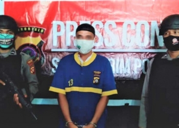 MDP tersangka kasus pembunuhan guru PAUD di Limboto, Kabupaten Gorontalo, Zeska Yuningsih saat konfrensi pers di Polres Gorontalo, Rabu (22/7/2020). ...